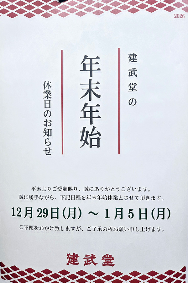 建武堂の年末年始の営業につきまして、下記の通りご案内させていただきます。